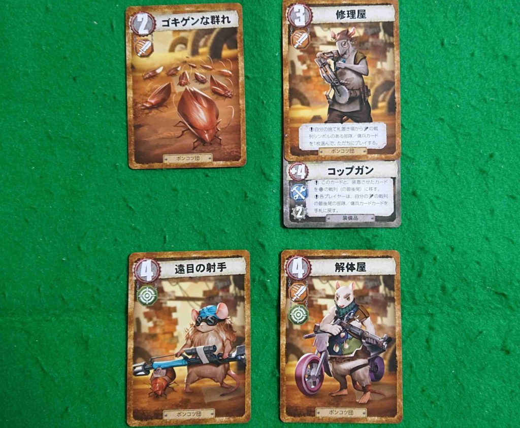 下の写真のように、装備カードは部隊・傭兵カードの下に追加攻撃力が分かるように重ねて置きます。
