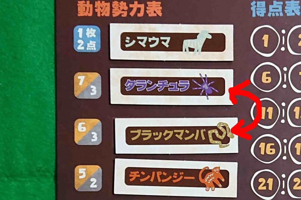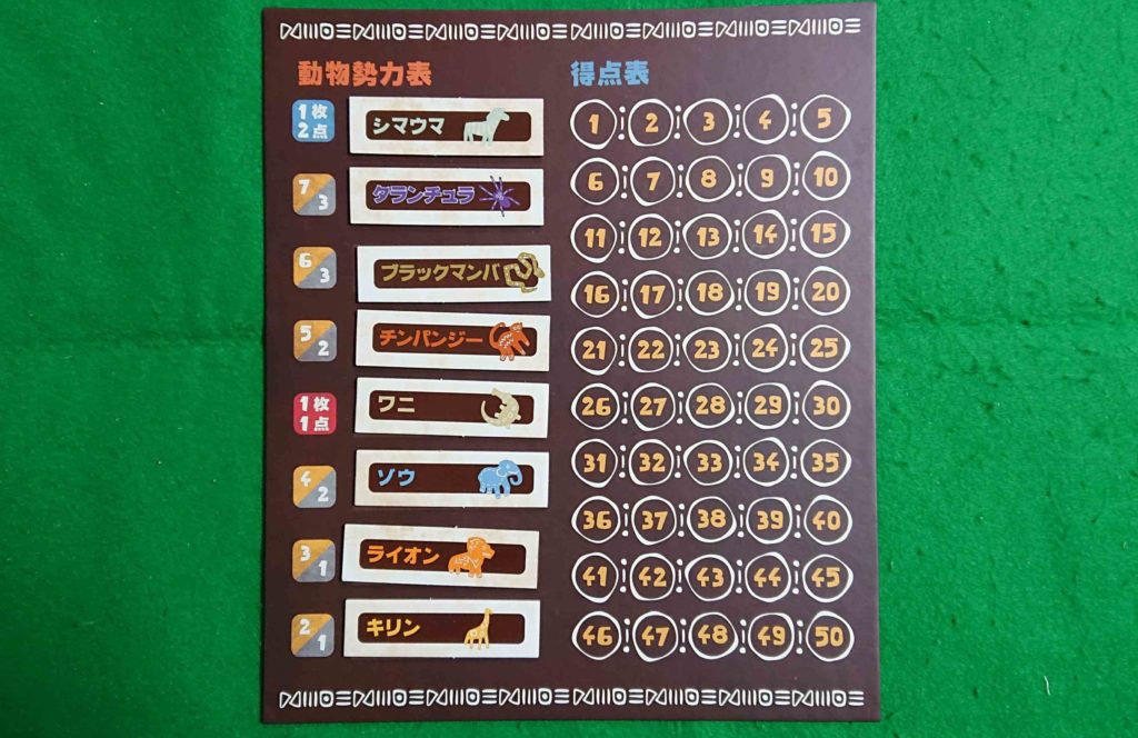 基本的に、動物勢力表の上の位置ほど得点が高くなります。