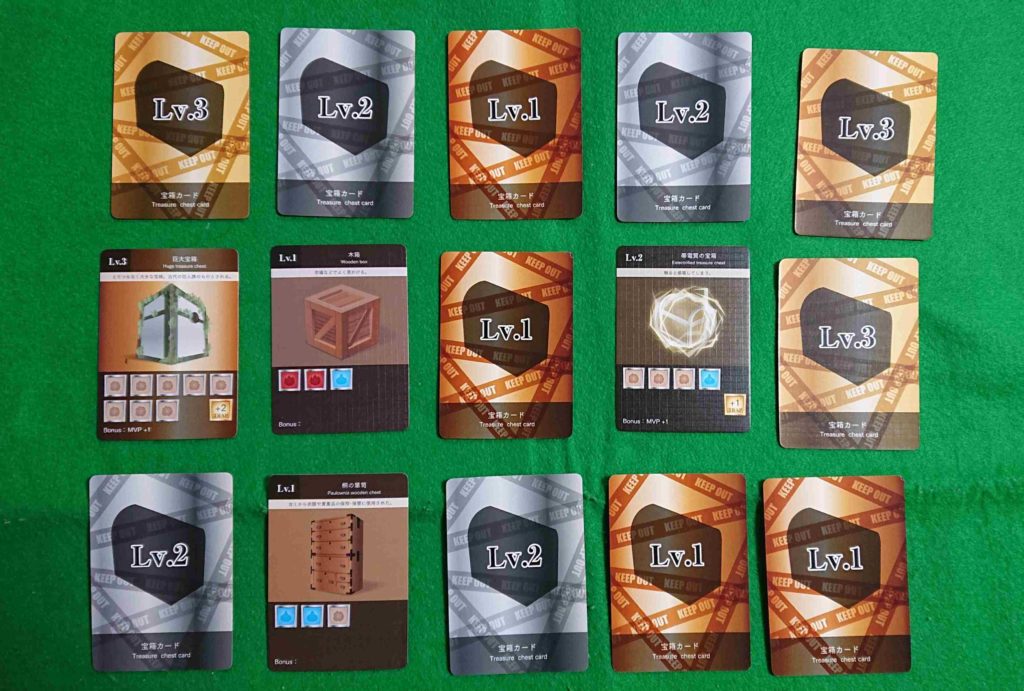 宝箱カードをレベルごとに分け人数にによる規定枚数だけ選び他は箱に戻します。良くカードをシャフルして裏向きで並べます(2人9枚・3人12枚・4人15枚)