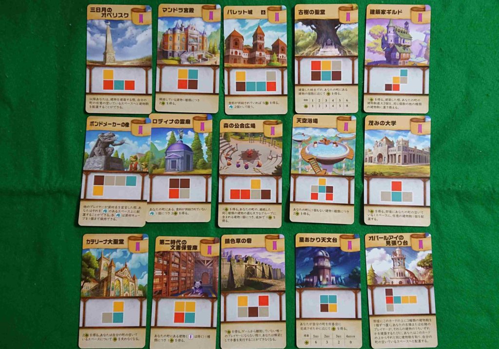 個人ボードも町は4×4の16マスしかありません。建築カードを7種類を選び場に並べます。