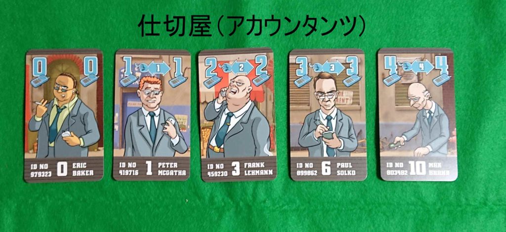 仕切屋は、すでにプレイして組事務所に置いてあるカードを、手札と交換することが出来ます。手札の仕切屋を1枚組事務所に出して、代わりに組事務所からカードを取ります。交換できる枚数は、仕切屋のランク以下の枚数です。