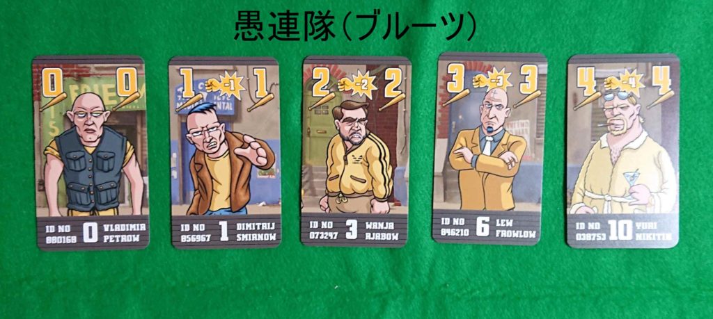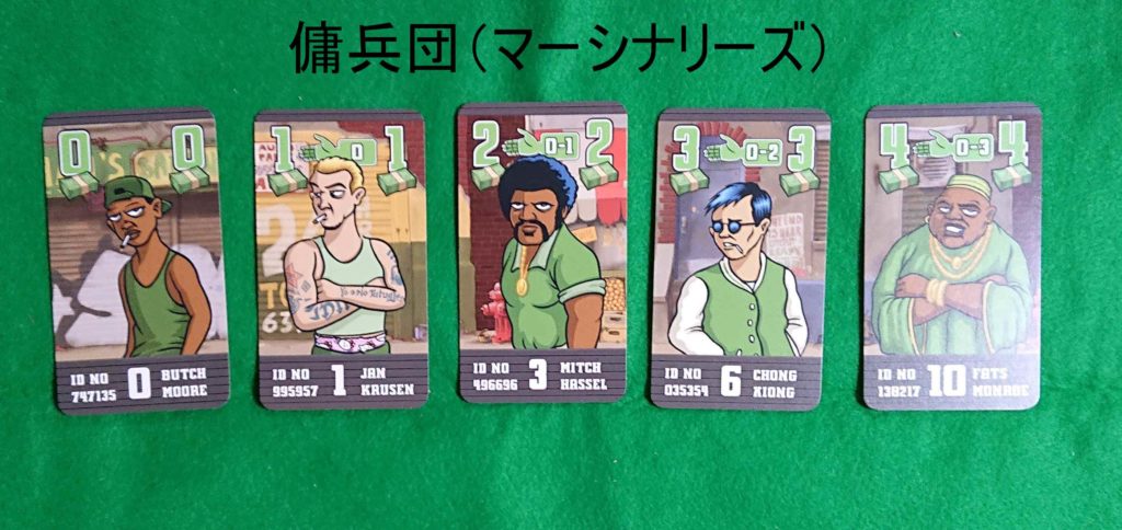 愚連隊のカードは、武闘派集団で他のカードを震えあがらせます。つまり、ストリートにいるカードのランクを下げることが出来ます。組事務所に1枚出すことで、ストリートのカードのランクを下げます。下がる数字は、傭兵団のランクだけ下がります。ただし、ランクが0以下になることはありません。