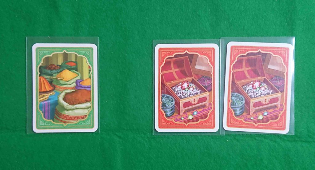 多くの品物を出来るだけ一度で多くのセットで取るほどボーナス点が多くもらえます。よって、手札を出来るだけ貯めて一気に品物に変えた方が有利なのですが、手札制限があるので、そこが良いジレンマになっています。