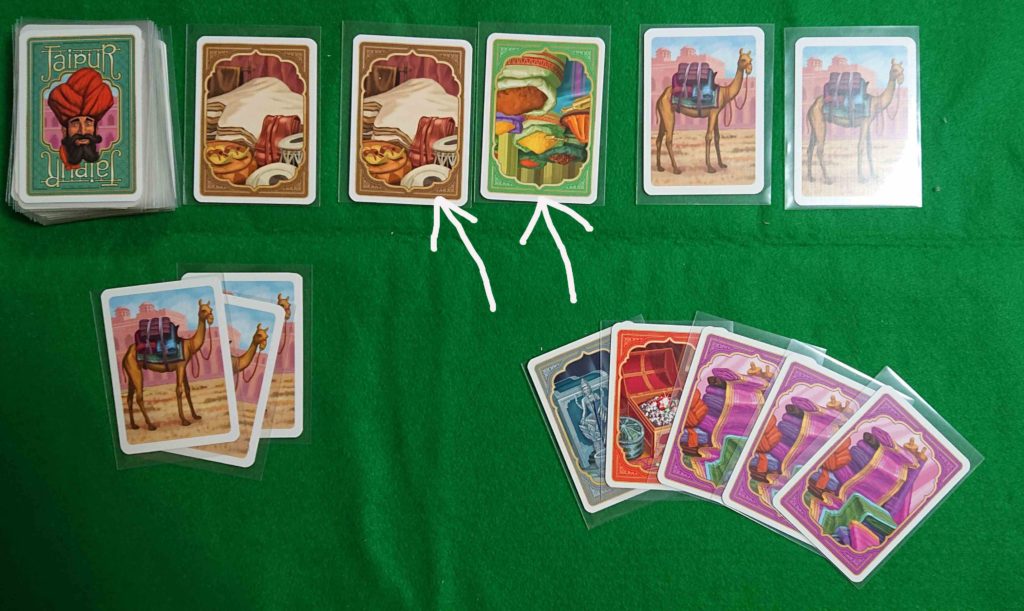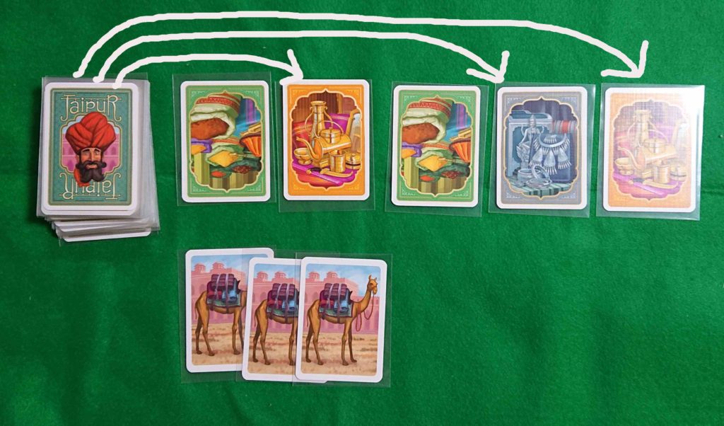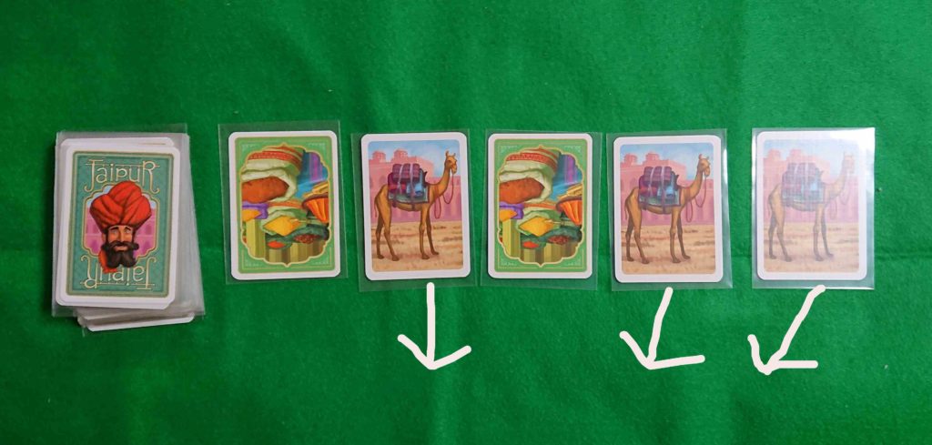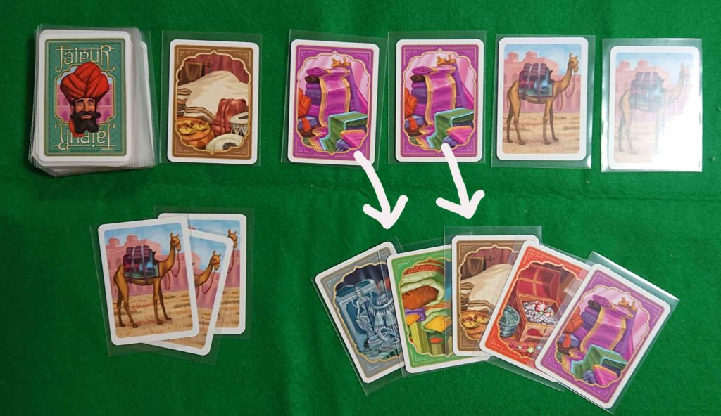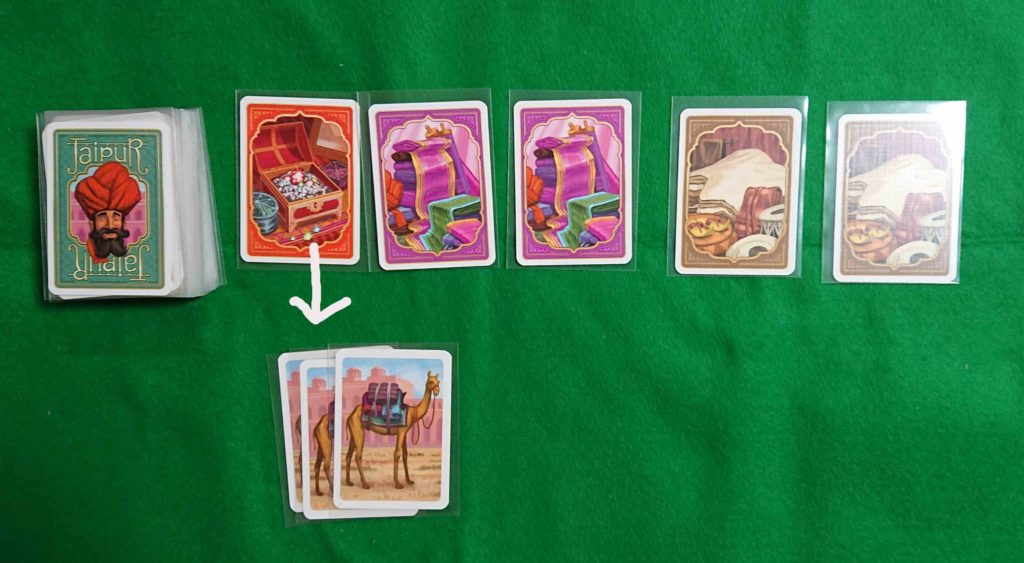 市場にあるラクダカードをすべて取ります。(取るときはラクダカードを市場に残しはいけません)その後、山札から補充します。獲得したラクダカードは手札に加えないで、自分の前に表にして重ねて置きます。(手札制限に関係なく置けます)
