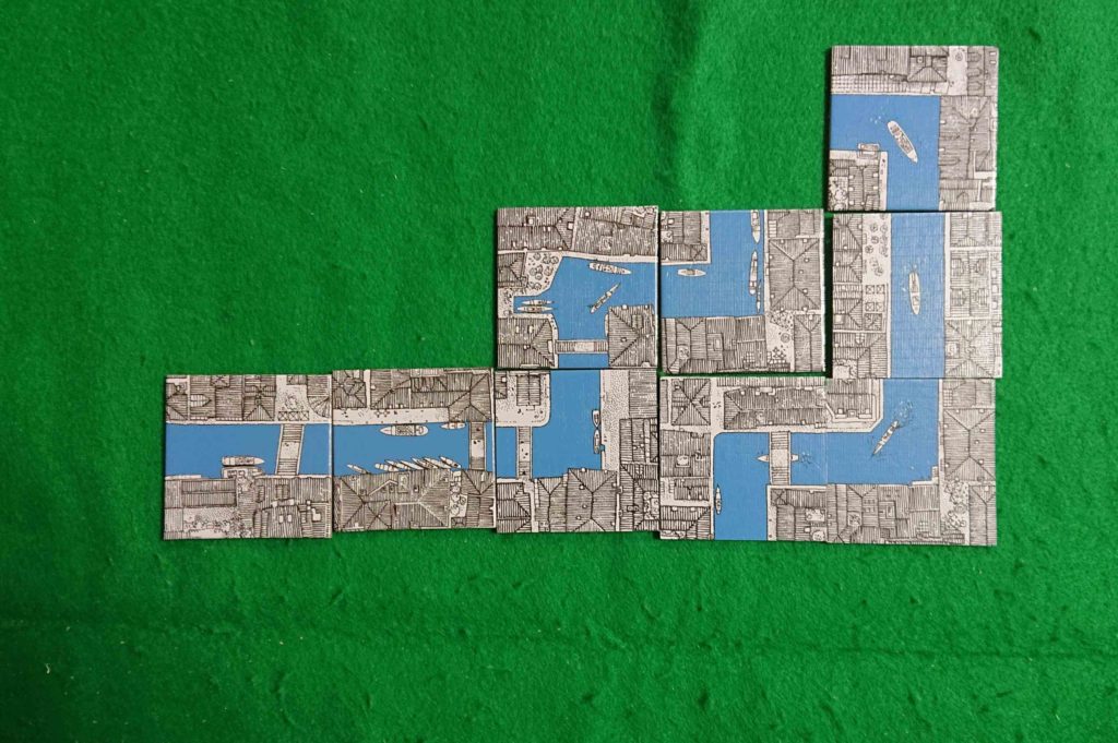タイルを交互に1枚~3枚まで置いていきます。自分の手番でタイルを配置したときに、運河を1周出来る輪ができれば勝ちです。