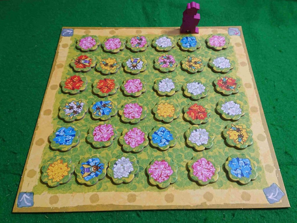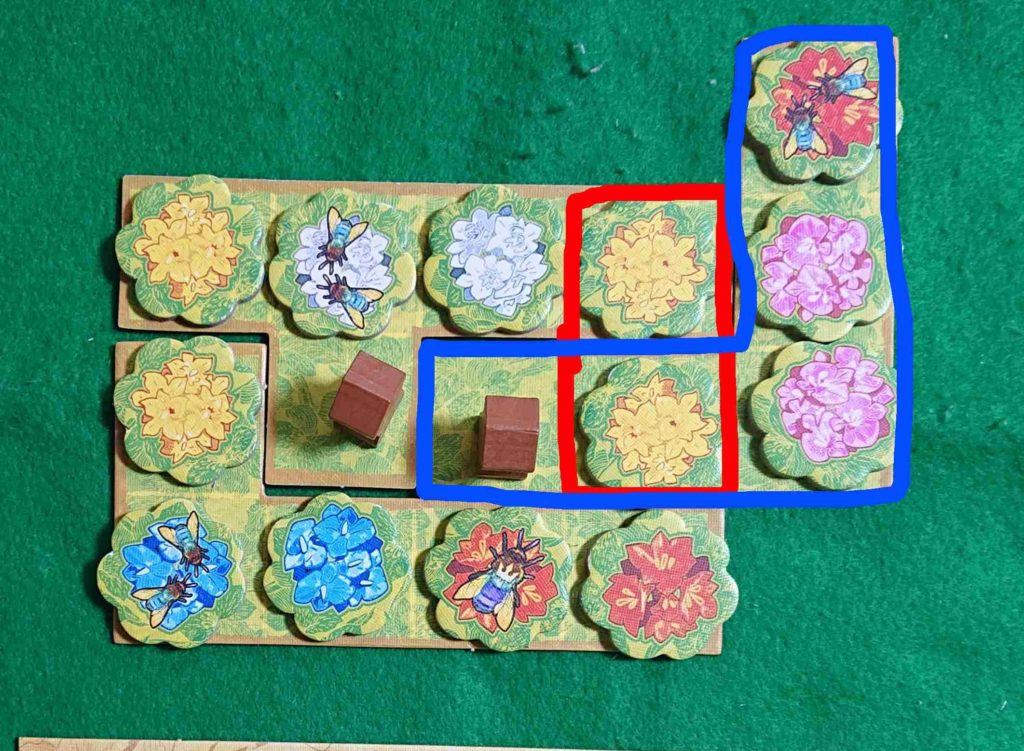 庭園タイルを置いたときに同じ色のランの花があると勝利点が入ります。また、ゲーム終了時に養蜂箱の周囲にハチの描かれたランの花があると勝利点になります。