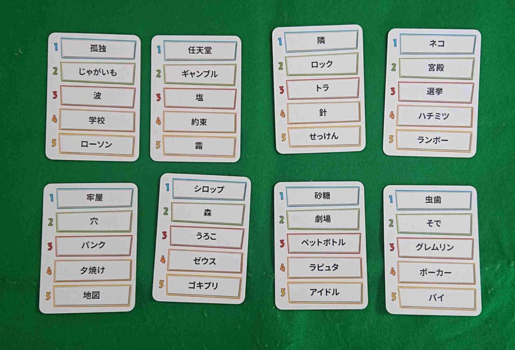 お題カードです、110枚あって各カードに5つ書いてあります。