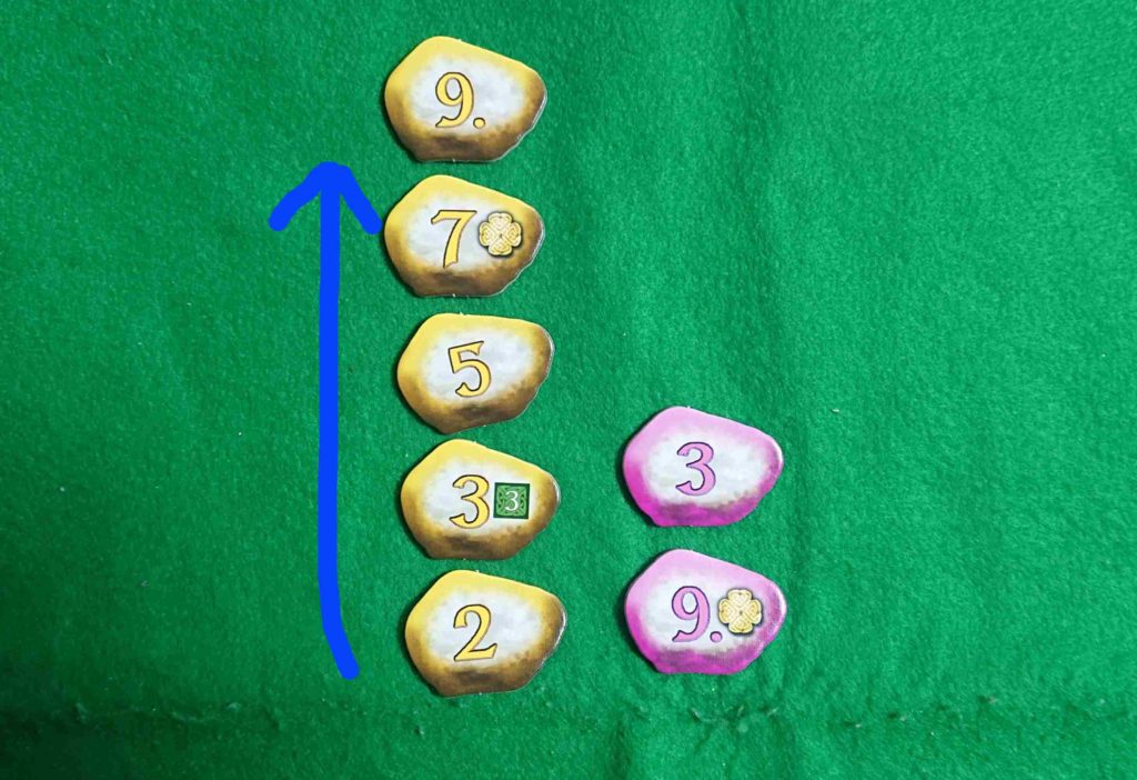 タイルを1枚めくり手元に配置していきます。手元に配置した同じ色のタイルは数字の小さい順または数字の大きい順に並べていかなければなりません。