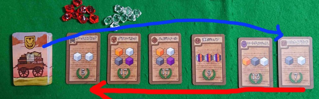 馬車カードに並べた注文カードが同じ都市の注文カード2枚または任意の注文カード3枚になった時はその都市に(3枚の時はその内のどこかの都市)自分の商館コマを自分の出荷エリアに置きます。