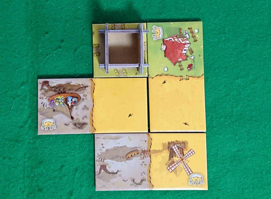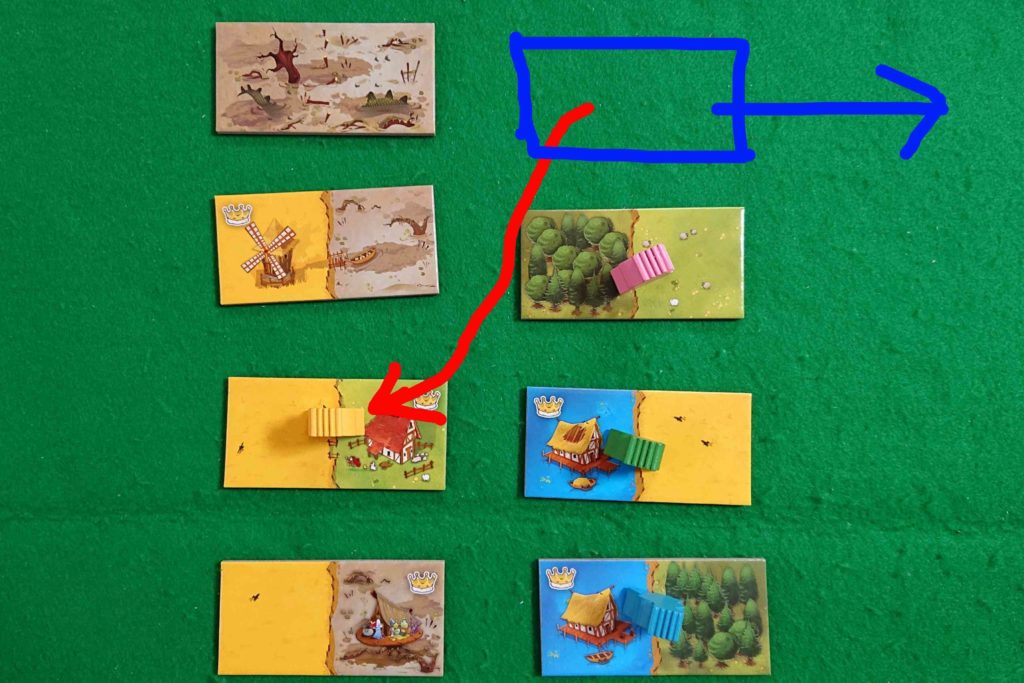 ゲームの大きな流れは、タイルを1枚取り、自分の城に同じ地形が接するよう5×5になるように並べていきます。