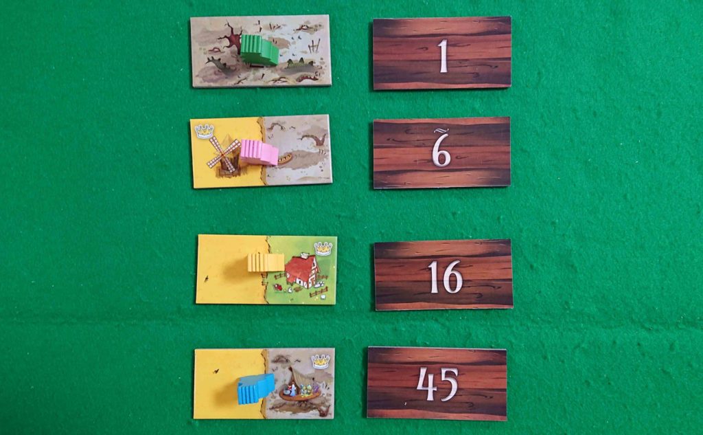 つまり、数字の小さいタイルは得点はしにくいが手番が早く来るので次回に自分の好きなタイルを取りやすくなります。逆に数字の大きいタイルを取ると得点はしやすくなりますが、次の手番は遅くなるので好きなタイルが取れなくなります。