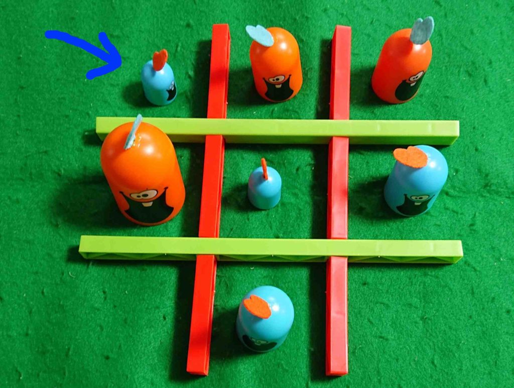下の写真の場合は、青い小のコマの上にオレンジの大のコマを被せました。