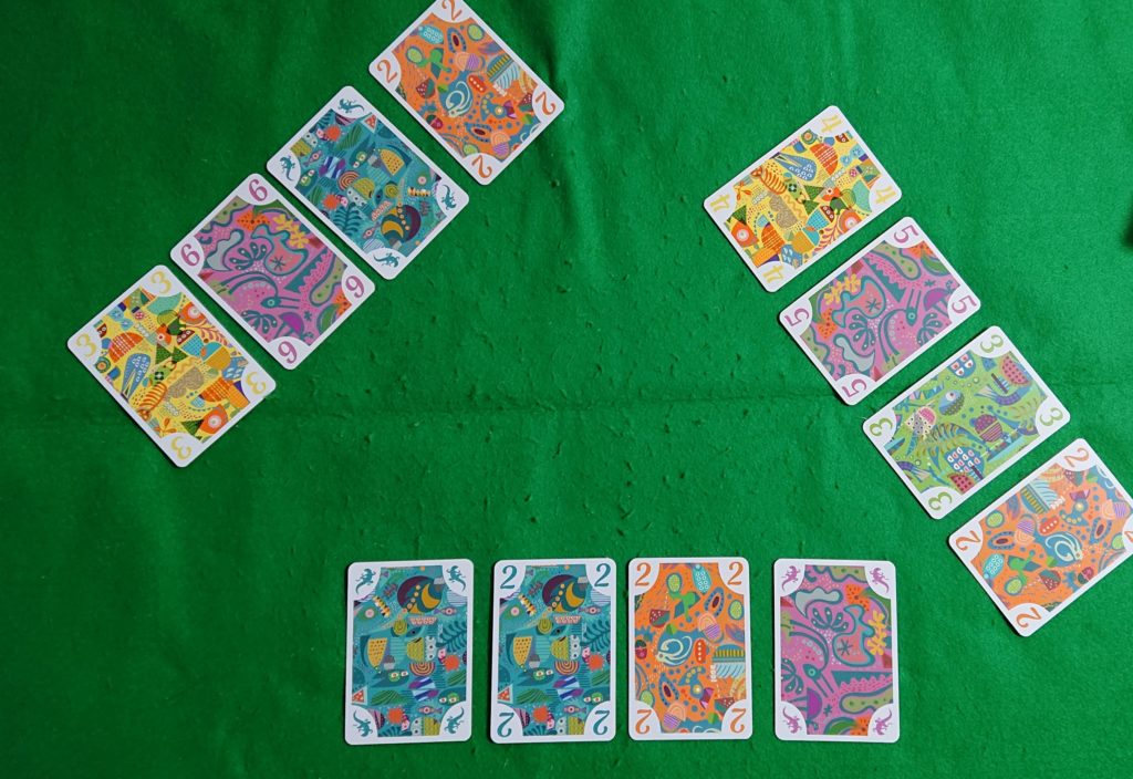 各プレイヤーは一斉にカードを2枚裏向きに出して、一斉に表にします。その後は1枚ずつ、計3回(最終的に4枚)出すとラウンド終了です。その後スコアリング(得点計算)を行います。