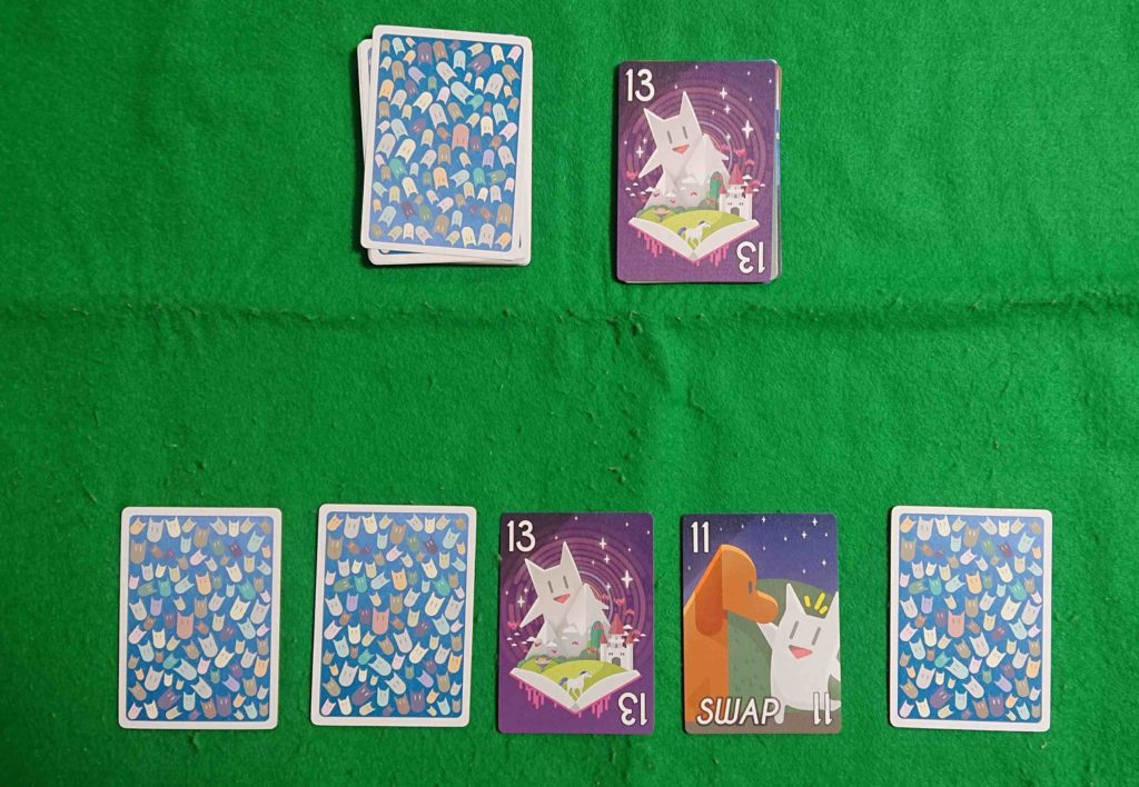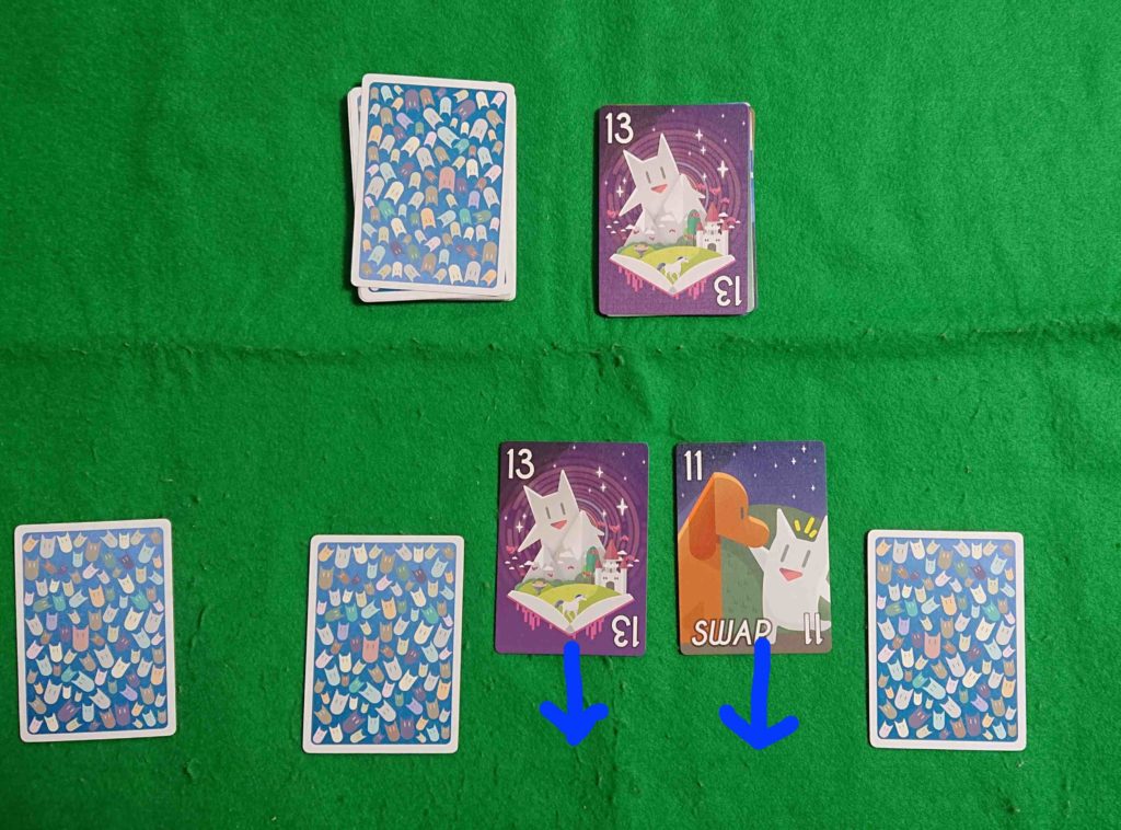 手番では山札または捨て札から1枚カードを取り数字を見て、自分のカードと交換していきます。
