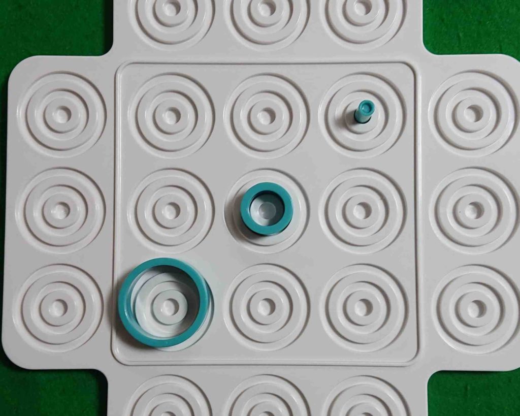 手番ごとに自分の色の3種類の輪を1個ずつ配置していきます。早く3つの輪の列を作ったプレイヤーの勝利です。
