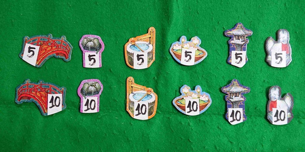 写真の上段は、囲い地トークン(1個)・3名所10点トークン(2個)・全名所5点トークン(2個)