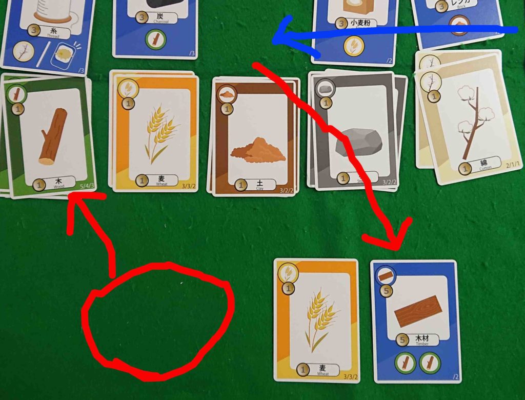 例えば下の写真の場合は、基礎資源カードの麦カードをⅠ次資源カードの小麦粉に交換することが出来ます。
