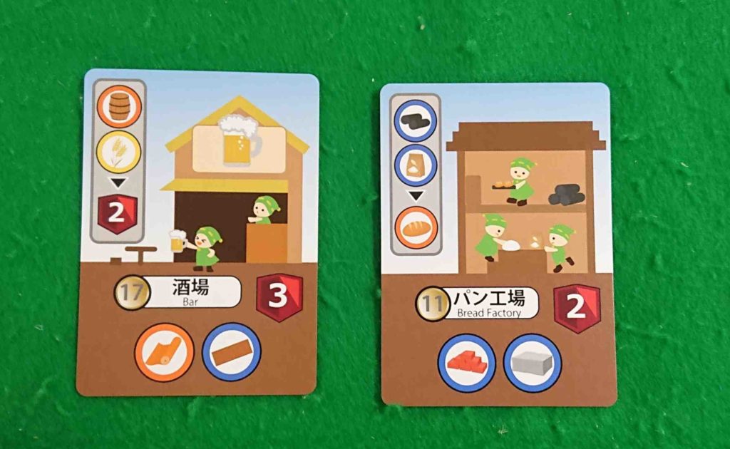 基礎資源カード・Ⅰ次資源カードは複数枚ありますが、Ⅱ次資源カード・建物カードはすべて異なるカードになっています。よって、その場に今見えているカードを見て、どのように効率よく「生産」「売買」を繰り返して勝利点を稼いでいくのかを考えていきます。
