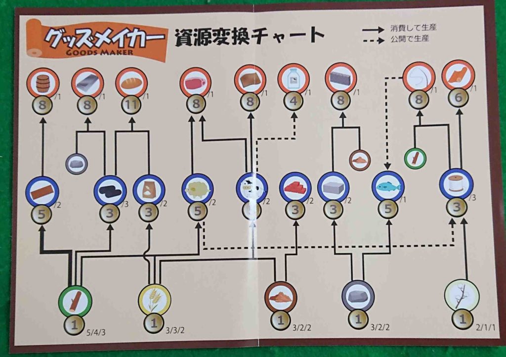プレイヤーは手番で、「生産」と「売買」を行います。「生産」は資源を使用して新たな資源や建物を作っていきます。「売買」は同じ価値の資源同士を交換していきます。