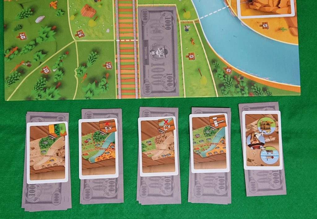 購入した区画に鉱山カードまたは牧場カードがある場合はそれをめくり書かれた金額を銀行からもらいます。