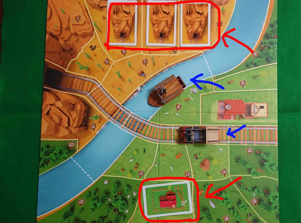 機関車コマ・船コマをそれぞれ線路と川の好きな場所(青い矢印)に置きます。