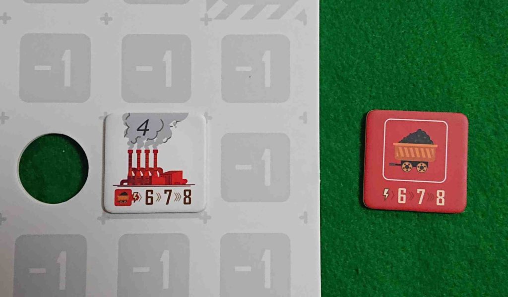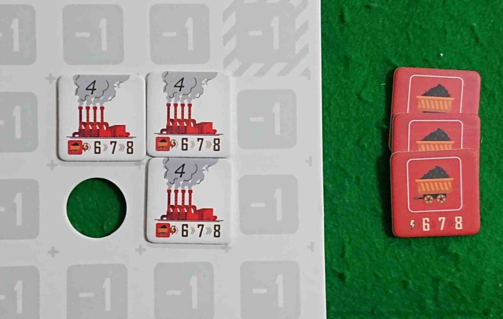 プレイヤーボードの5×5のマスに発電所タイルや公共施設タイルを配置していきます。また発電するための燃料も確保していかなければなりません。