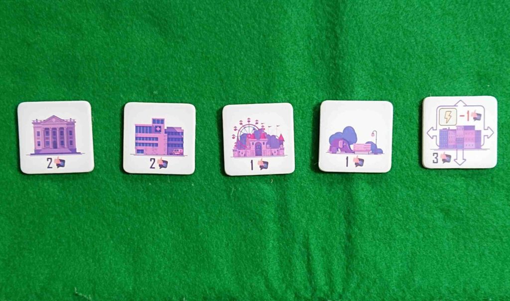 公共施設タイルを配置すると支持率が上がります。支持率以上に大気汚染が増えると得点が大幅に減点されます。その他いろいろなカードの条件が作用します。