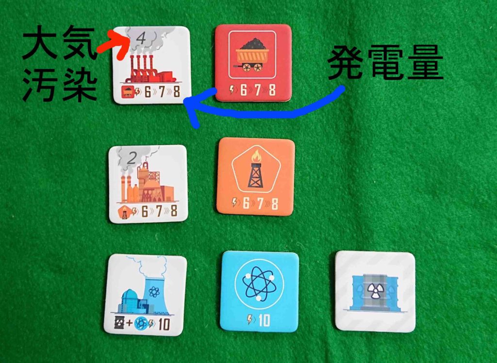 発電所タイルを配置して発電をすると点数が入りますが、大気汚染が増加していきます。