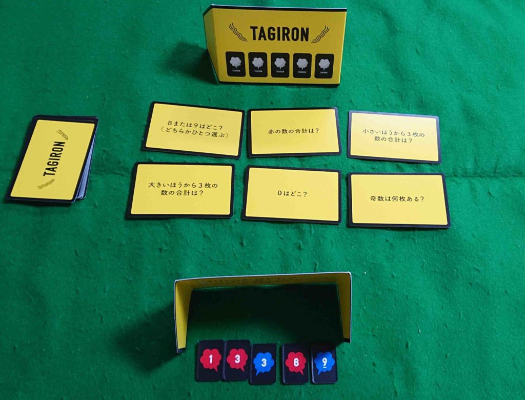 質問カードを良くシャフルし中央に6枚並べます。残りは山札として置きます。