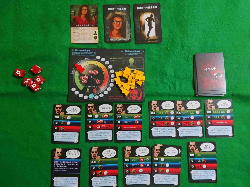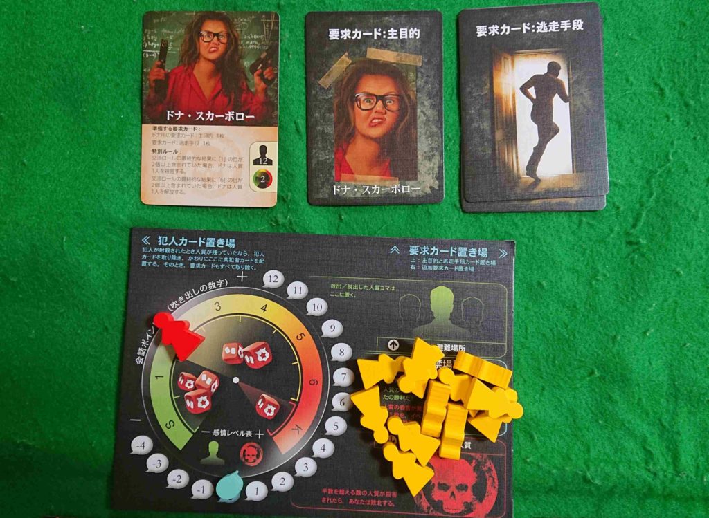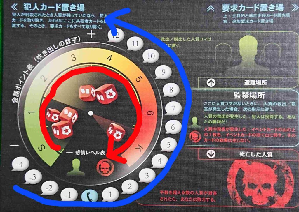 犯人の感情レベルが悪化して最悪レベルになると犯人は人質を殺害していきます。逆に感情レベルが安定して冷静になると人質を解放します。犯人の感情レベルによって、振ることができるサイコロの数も変化します。