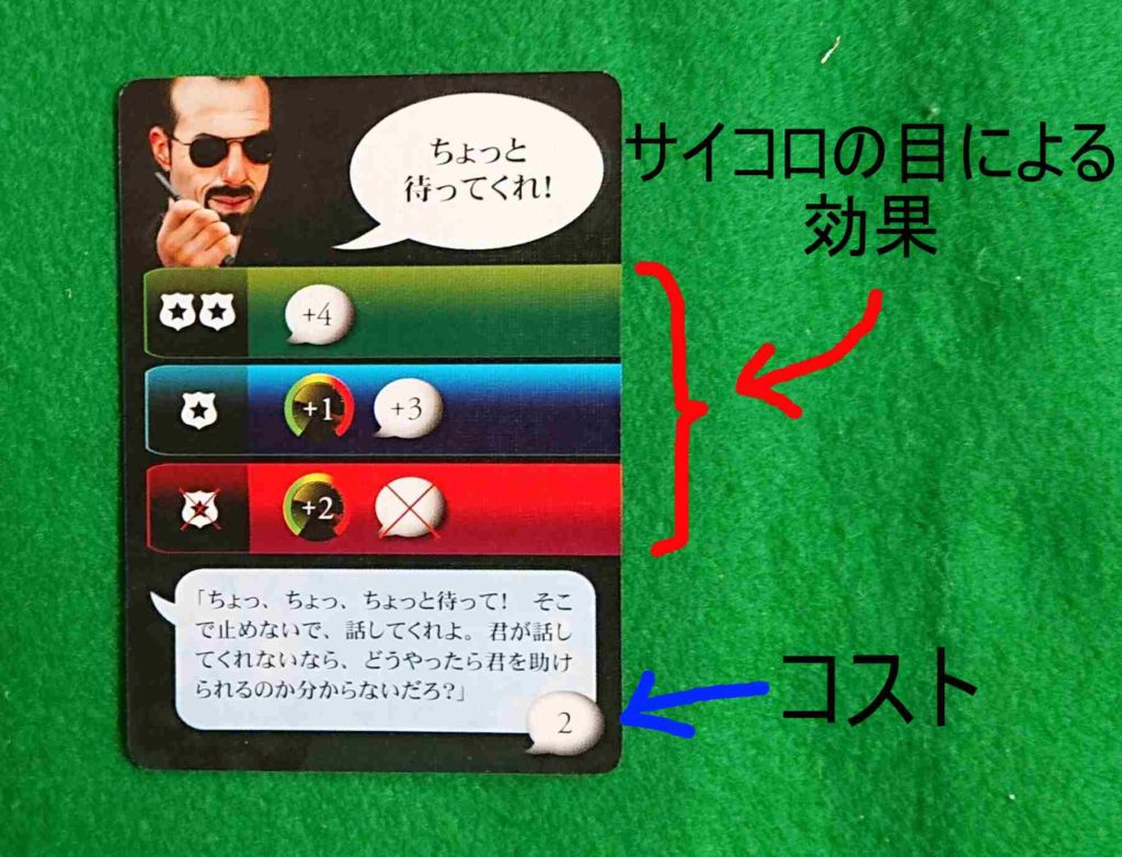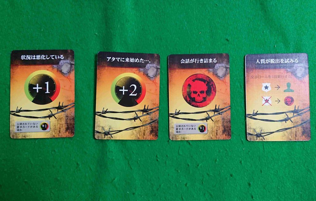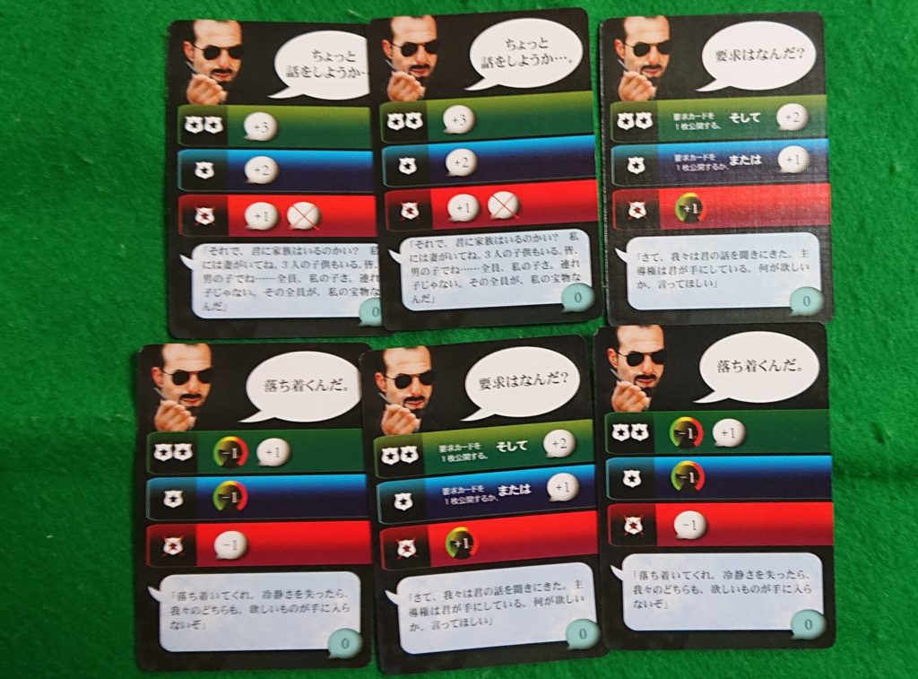 会話カードを使用しながら、犯人と交渉していきます。犯人の感情レベルと交渉ポイントという要素があります。