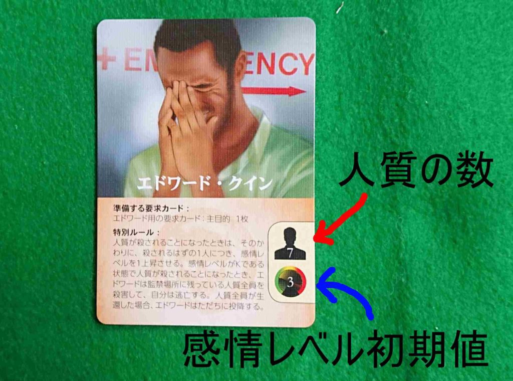 犯人カードに描かれた人質の数のコマと感情レベルにコマを状況ボードに置きます。