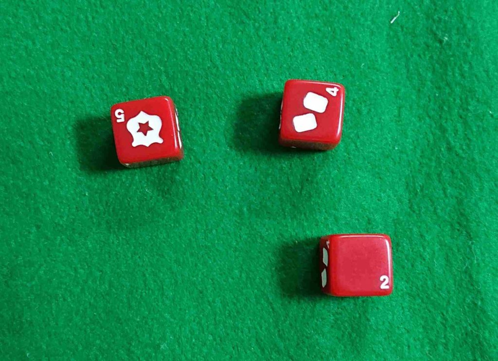 サイコロが5個あります。1~3が無印・4はカード・5と6は成功マークになっています。
